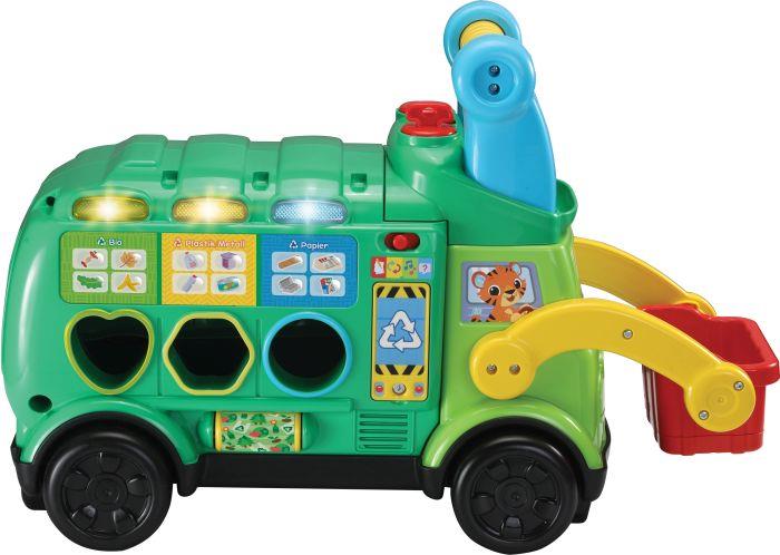 Rutschfahrzeug und Sortierspielzeug in einem, das aus nachhaltigem Material besteht und das Thema Recycling spielerisch vermittelt. Nachhaltiges Spielzeug aus wiederverwertetem Plastik. Rutschfahrzeug zum Thema Recycling aus wiederverwertetem Plastik mit 6 Formenklötzchen, die an der Seite des Müllwagens einsortiert werden. Durch die Formenklötze entwickelt ds Kind seine feinmotorischen Fähigkeiten und wird in das Thema des Recyclings bzw. der Mülltrennung eingeführt. Jedes Klötzchen steht für ein Beispiel von Verpackungsmüll, Papiermüll oder Bioabfällen. Die Müllart sowie die Farben und Formen der Klötzlichen werden vom Müllwagen erkannt und benannt. 12 Lerntasten, um noch mehr über Recycling und Farben zu lernen. Drehbarer Zündschlüssel und Hupentaste. 3 bunte LED-Lichter. Schaufel mit Öffnung an der Unterseite, mir der die Formen eingesammelt und in das Müllauto geworfen werden können. Die Formen können im Inneren des Müllwagens aufbewahrt werden und lassen sich über die Tür auf der Rückseite wieder rausholen. 2 Spielmodi: Lernen und Suchspiel. 9 gesungene Lieder und 6 Melodien. Lautstärkeregler, Abschaltautomatik und kindersicheres Batteriefach. Demobatterien enthalten. Ab 18 Monaten.