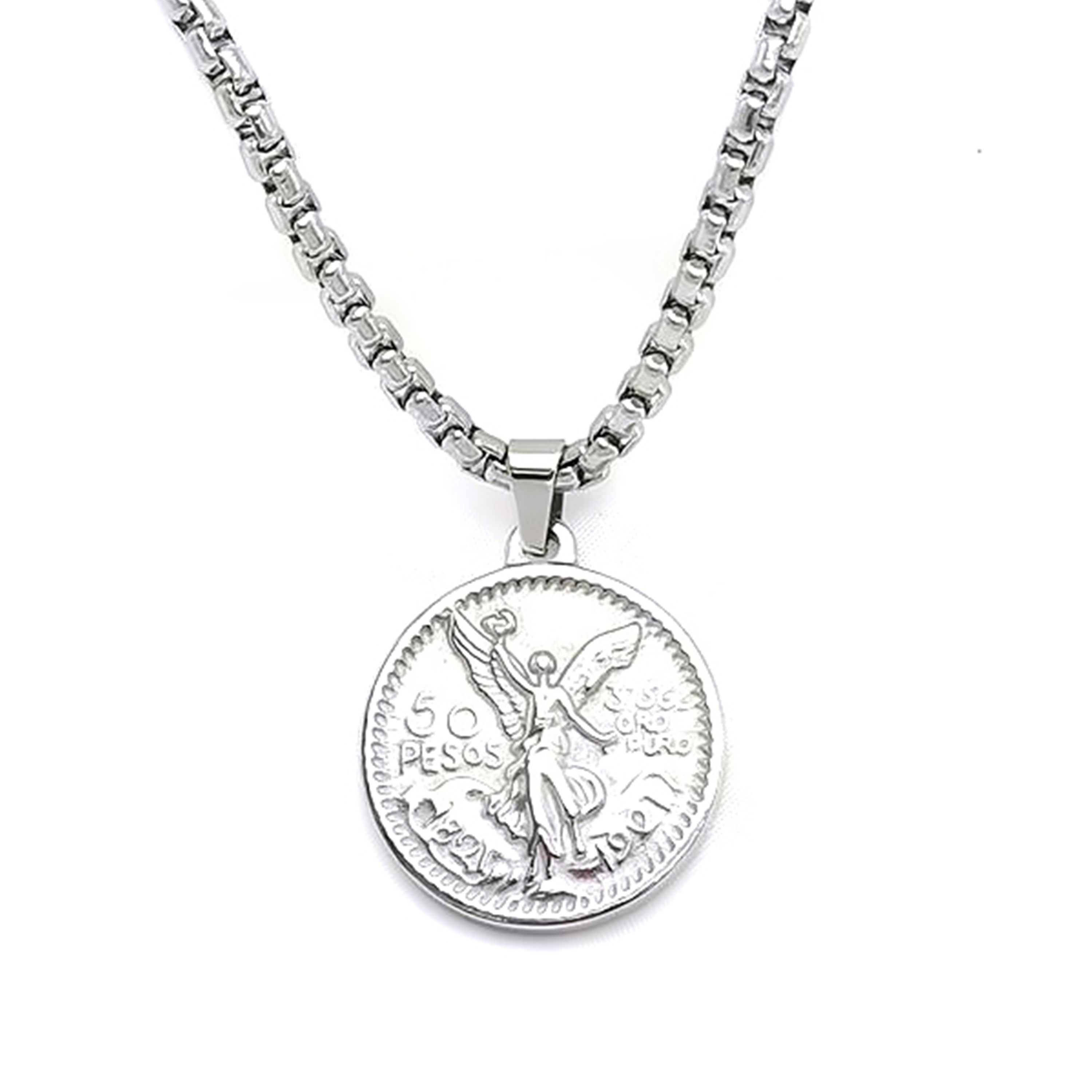Der Anhänger zeigt eine mexikanische 50 Pesos Münze welche beidseitig tragbar ist.