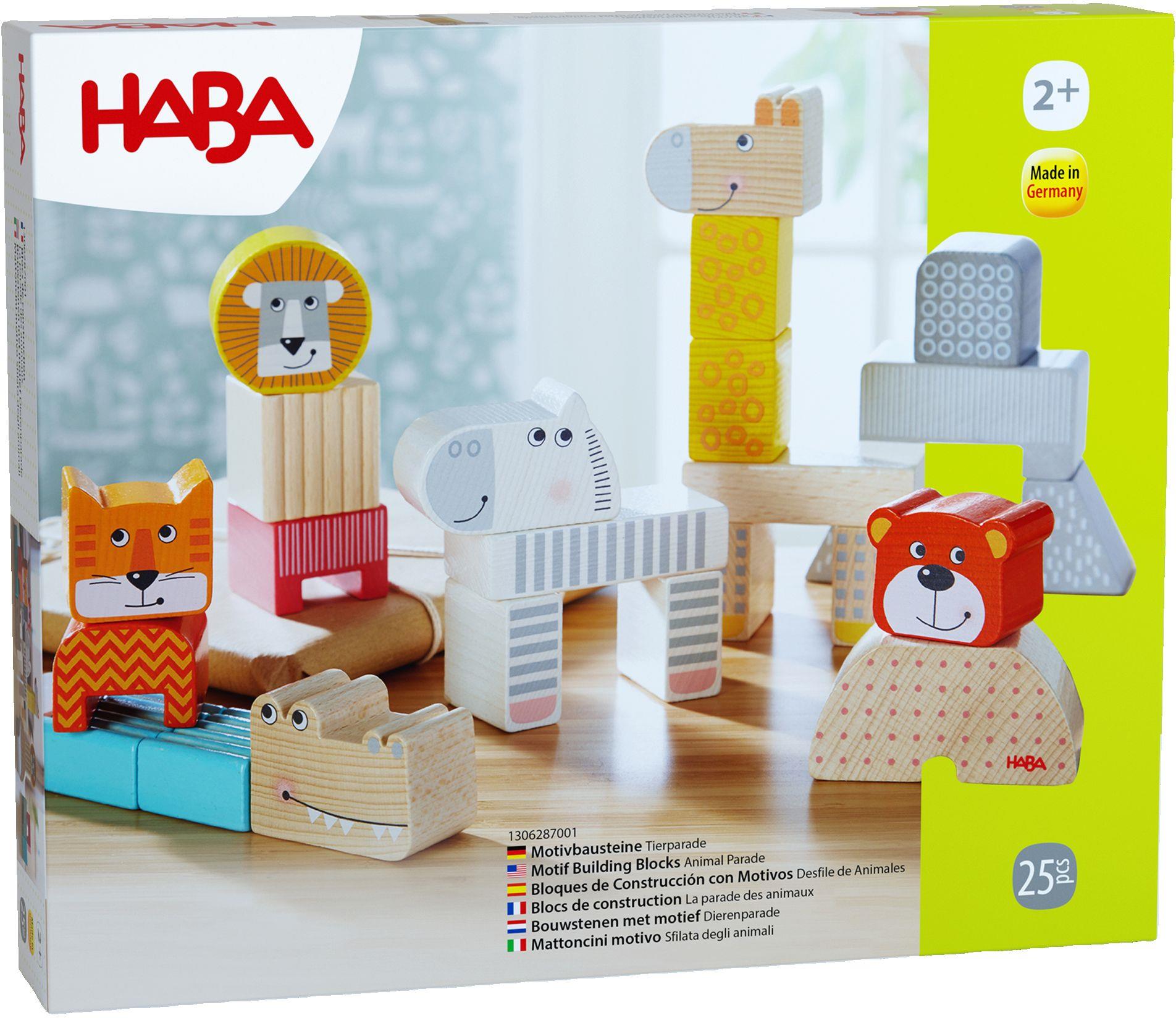 Giraffe, Löwe, Zebra & Co. stellen sich zur großen Tierparade auf und kleine Baumeister können ihnen dabei helfen! Aus den Bausteinteilen mit verschiedenen Farben und Mustern lassen sich die Tiere immer wieder neu – und manchmal auch ganz durcheinander – zusammensetzen. Das sorgt für jede Menge Spielspaß und fördert die Kreativität. Bietet vielfältige Bau- und Stapel-Möglichkeiten. Inhalt: 25 Baumsteine. Material Buche. Maße: Würfel 4x4x4 cm. Schult die Geschicklichkeit und Kreativität. Ab 18 Monaten.