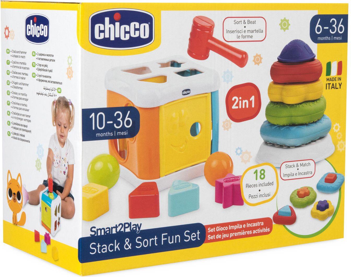 2 in 1 Sortier & Schlag Würfel •Altersgruppe: 10-36 Monate •Enthält 4 bunte Formen, 2 Bälle und den Hammer •Formensortierer: 4 bunte Formen, die auf 2 Würfelseiten eingesetzt werden können •Hämmern: lustige Aktivität für Kleinkinder zur Entwicklung von manuellen •Türen lassen sich öffnen, um die Bälle und Förmchen herauszunehmen 2 in 1 Ringtower •Altersgruppe: 6-36 Monate •4 Ringe in verschiedenen Größen zum Stapeln •4 verschiedene Formen zum Einfügen •Die Schaukelbasis macht das Spiel noch unterhaltsamer •Die strukturierten Oberflächen stimulieren die Feinmotorik
