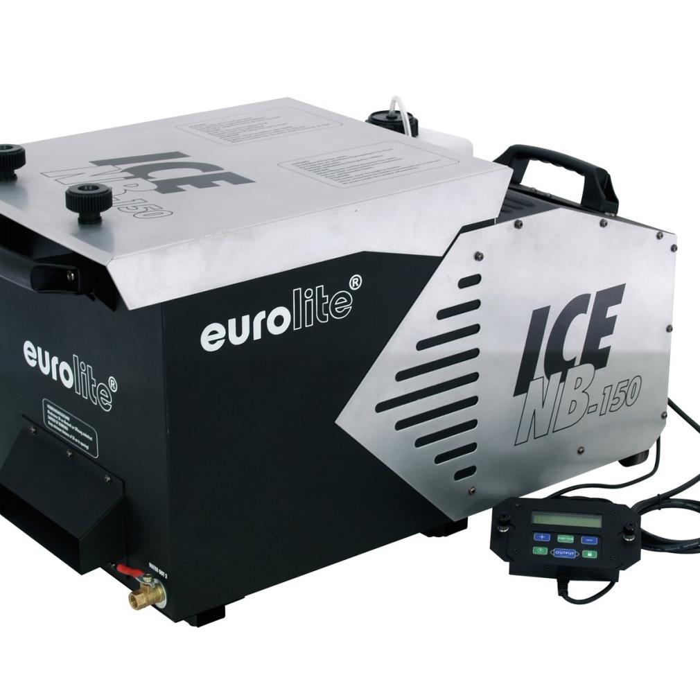 Einfaches Bodennebelgerät mit 1500 W, Fernbedienung, EiswürfelkühlungDer EUROLITE NB-150 ICE Bodennebler erzeugt große Mengen tief liegenden Bodennebel. Er ist für Bühnen und Diskotheken optimal geeignet. Punkten kann der NB-150 ICE mit seiner kurzen Aufwärmzeit und seinem niedrigen Fluidverbrauch. Er funktioniert mit herkömmlichem Nebelfluid und Eiswürfelkühlung. Um 25 Minuten Dauernebel bei vollem Ausstoß zu erhalten, müssen Sie den Bodennebler mit vier Kilogramm Eiswürfeln befüllen. Sie können den NB-150 ICE ganz einfach über die Ablassvorrichtung entleeren und reinigen. Der Tank ist herausnehmbar. Die Auslösung des Nebeleffekts erfolgt per DMX oder über das integrierte Steuermodul mit LCD-Anzeige. Alternativ können Sie den Bodennebler ganz einfach mit der kabelgebundenen Fernsteuerung ansteuern.Die Temperatur können Sie mit dem Thermoschalter einfach regeln. Intervalle, Dauer und Nebelmenge sind ebenfalls – je nach Ihren Bedürfnissen – variabel einstellbar. Das stabile Metallgehäuse ist mit Tragegriffen und Transportrollen ausgestattet.