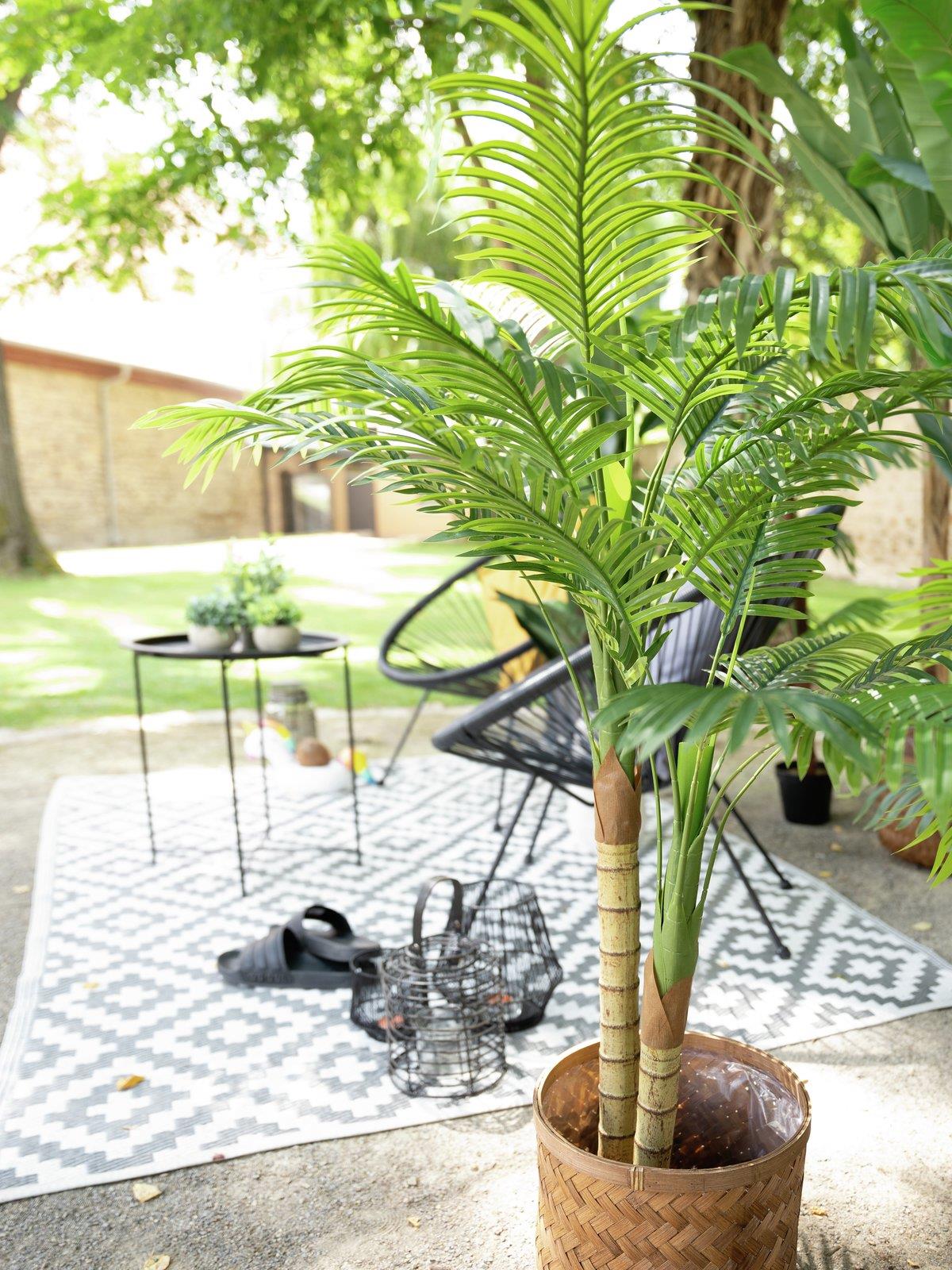 Ob für Ihre Wellnesslandschaft, den Wintergarten oder im gewerblichen Bereich – die mehrstämmige Betelnusspalme von Europalms ist die perfekte Ergänzung Ihrer Wohlfühloase.Denn während Echtpflanzen viel Licht und Wasser benötigen, ist diese Kunstpflanze absolut pflegeleicht und nimmt Ihnen selbst Temperaturschwankungen nicht übel.Die schlanke Fiederpalme besteht hier aus zwei, in der der Höhe unterschiedlich abgestuften, rohrähnlichen Stämmen, deren typische, ringförmige Blattnarben gut zu erkennen sind. Am oberen Ende der Stämme bilden lange Wedel eine Krone. Sie haben nur einen Blattstiel und wirken, als wären sie aus einem einzigen, ovalen Blatt entstanden.Ein schlichter Gärtnertopf dient als Standhilfe und erleichtert Ihnen das Eintopfen in einen passenden Übertopf.