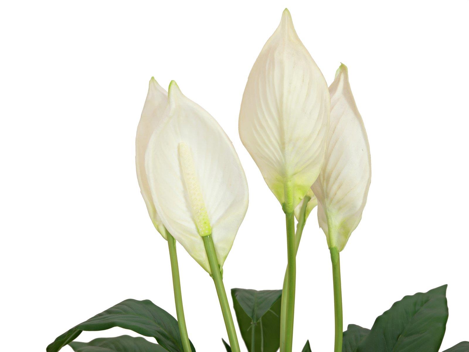 Diese elegante Zimmerpflanze ist auch unter den Namen Friedenslilie, Blattfahne oder Spathiphyllum bekannt. Sie findet Ihren Einsatz in Hotels, Wohn-, Büro- und Geschäftsräumen.Wie bei ihrem natürlichen Vorbild stehen bei der Kunstpflanze mehrere Triebe eng aneinander. Diese bilden den buschig wirkenden Horst der Solitärpflanze. Dunkelgrüne, glänzende Blätter stellen einen besonders schönen Kontrast zu den weiß- bis cremefarbenen Hochblättern dar. Fünf dieser dekorativen Blütenstände ragen hoch aus dem dichten Blattwerk heraus und besitzen durch ihre Soft-Touch-Qualität eine sehr natürliche Haptik.Die Kunstpflanze hat eine Gesamthöhe von ca. 60 cm und wird in einem dekorativen Keramikübertopf geliefert, als dessen Abdeckung künstliches Moos dient. Ein umständliches Eintopfen ist somit nicht mehr notwendig.