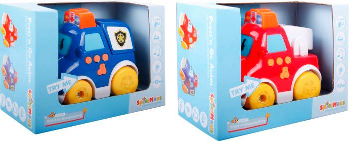 SpielMaus Baby Press und Go Fahrzeuge, 2-fach sortiert. Mit 3 realistischen Autogeräuschen wie Zündung, Motor und Bremse. Das Auto fährt auf Knopfdruck los und spielt 1 Melodie ab. Inklusive 3 x LR 44 Batterien. Maße ca. 13×7,5×11 cm. Für Kinder ab 12 Monaten.