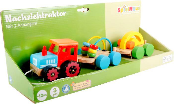 SpielMaus Nachziehtraktor mit 2 Anhänger. Maße ca. 20,5×16,5×9 cm. Für Kinder ab 12 Monaten.