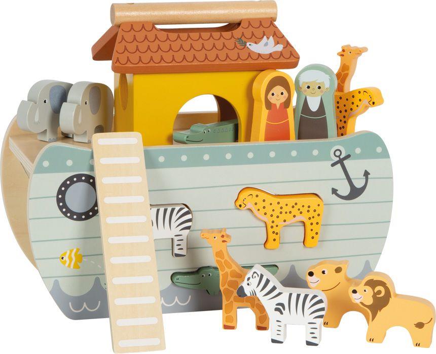 Auf ins Abenteuer der Arche Noah! Dieses Steckboot aus Holz in Form der Arche Noah ist nicht nur ein Formen-Steckspiel, sondern auch eine faszinierende Spielwelt, die für abwechslungsreichen und langanhaltenden Spiel- und Lernspaß sorgt. Das Steckspiel enthält 15 für Kinderhände gut zu greifende Holzfiguren, darunter 6 Tierpaare, 2 menschliche Figuren und eine Leiter. Alle Tierfiguren passen perfekt durch die Stecköffnungen des Schiffes und fördern beim Stecken die motorischen Fähigkeiten. Durch den abnehmbaren Deckel mit kindgerechtem Griff lässt sich das Steckschiff leicht öffnen, um die Holzfiguren zu entnehmen. Die liebevolle und detailreiche Gestaltung, der hochwertige Druck und die moderne Farbgebung machen zusammen mit dem hohen sichtbaren Holzanteil dieses 2-in-1 Holzspielzeug zu einem echten Hingucker im Kinderzimmer. Das Steckboot fördert neben motorischen Fähigkeiten und Formerkennung auch die kindliche Fantasie und animiert dazu, immer wieder neue, eigene Geschichten und Abenteuer zu erschaffen. Das Steckspiel Arche Noah ist ideal ergänzbar durch weitere Spiele der „Safari-Linie.